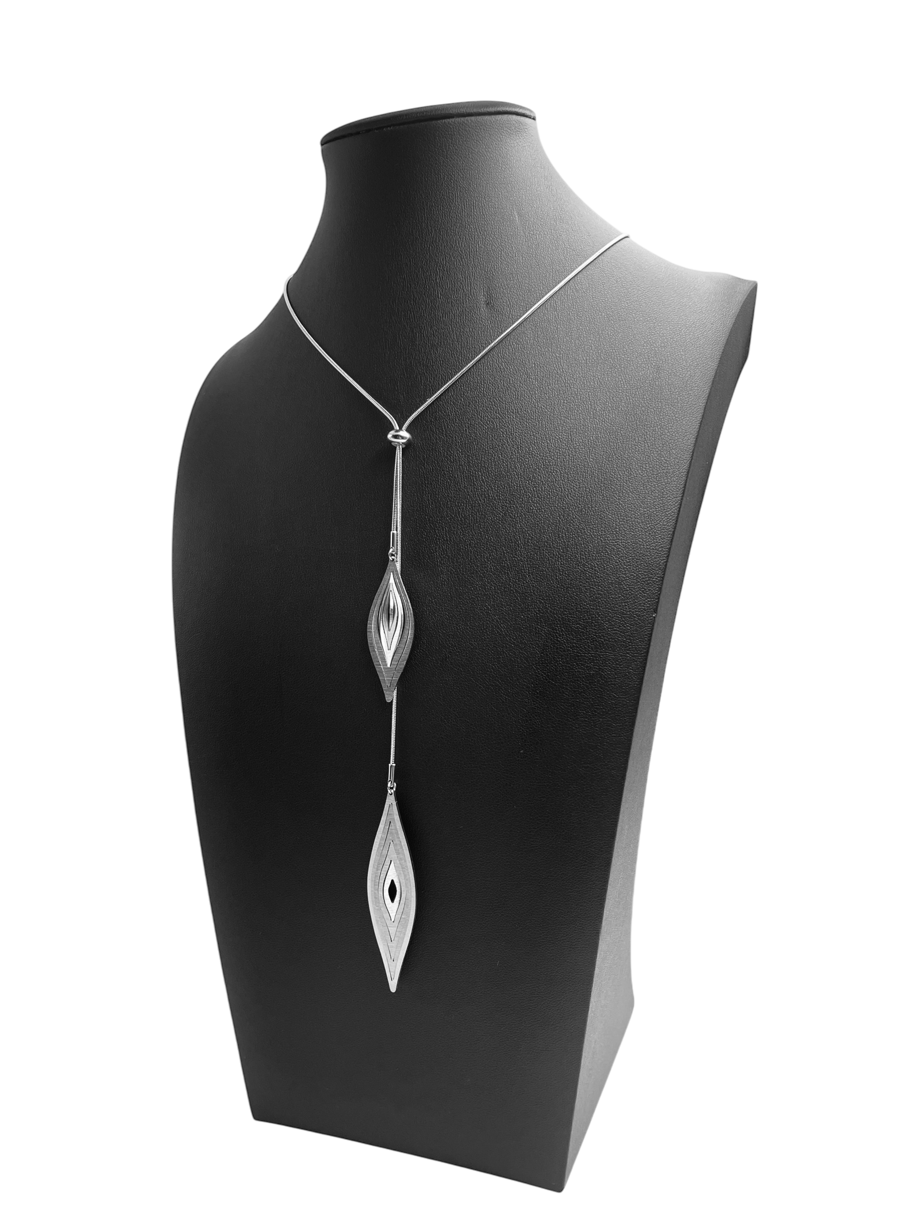 Handmade jewelry Illusion Leafs Pendant with a 1.2mm round snake steel chain and two leaf- shaped steel elements. With the ball washer you can adjust the pendant so that the elements are at the height you want depending on the clothes you are wearing. A convenient and impressive piece of jewelry for any occasion!